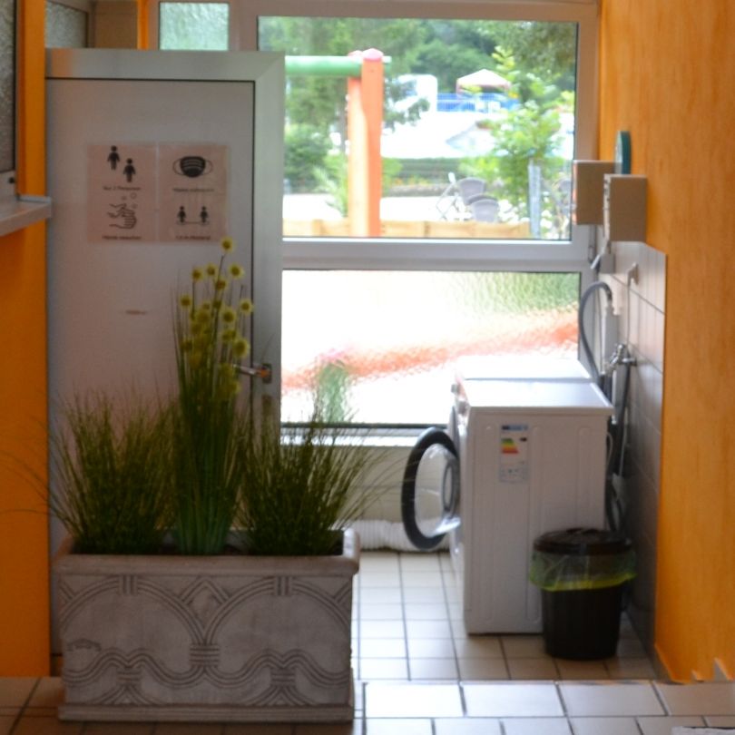 Im Sanitärgebäude stehen zwei Waschmaschinen und ein Trockner. Diese können mit 50-Cent-Münzen betrieben werden.
